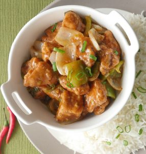 Garnish with green onion leaves and serve with rice.
