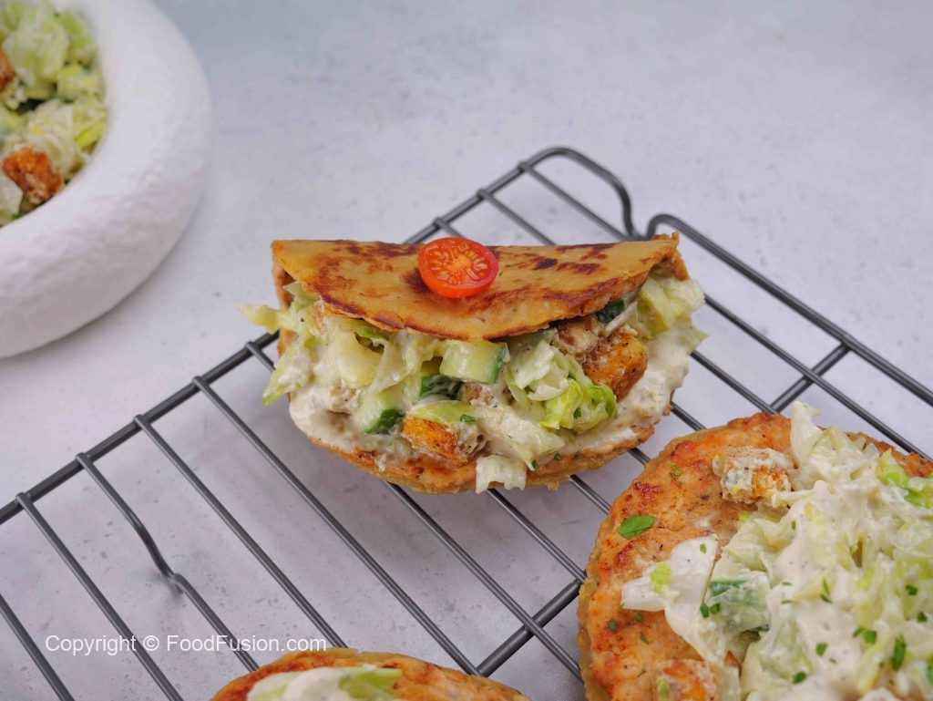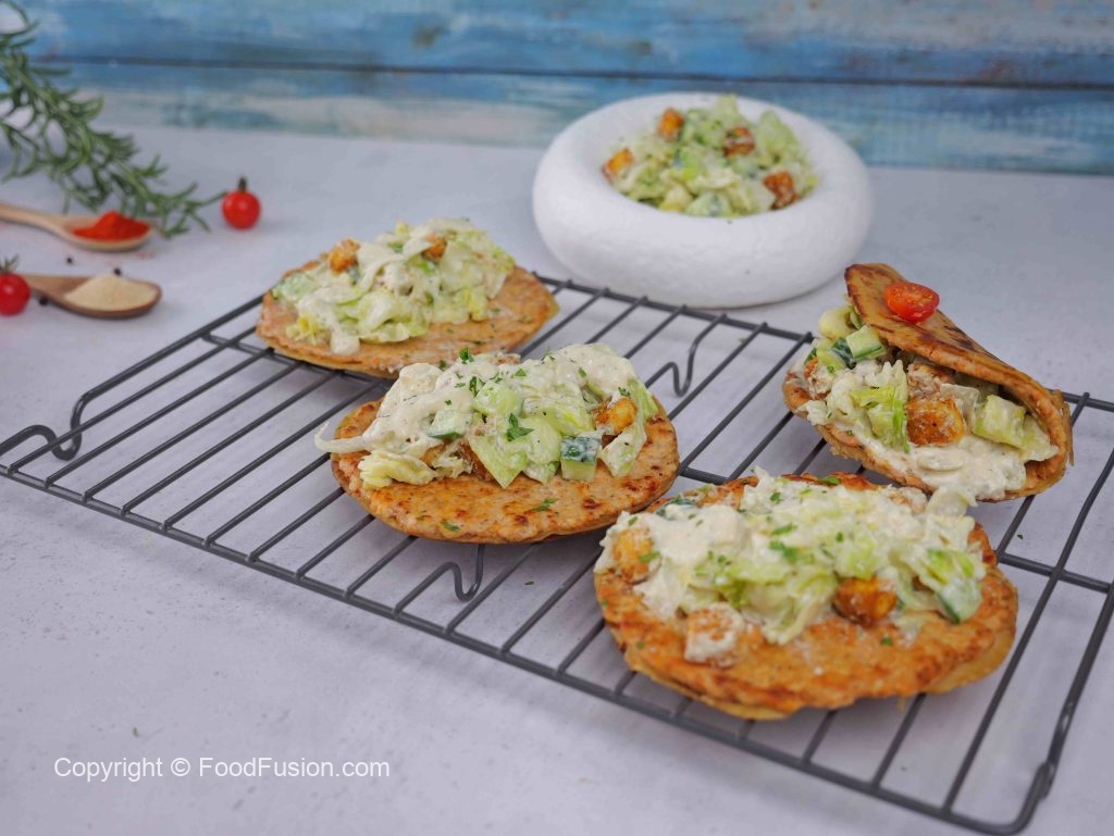 -In a greased pan add tortilla (upside down), cook on medium flame for 2-3 minutes, flip it then cook for 1-2 minutes or until light golden & crispy.
