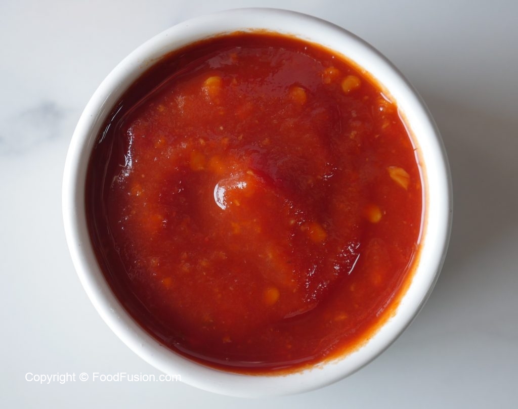 Put it on stove,in tomato puree,add blended red chilli mixture,sugar,mix well and bring it to boil and cook on medium to low flame until it thickens (approx. 35-40 minutes) and keep mixing in between (check by cold plate technique method) and cook for 8-10 minutes more to remove moisture and again check by cold plate technique method.