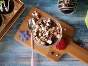 In each chocolate cup,add chocolate milk powder,mini marshmallows and chocolate chips.