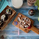 To make hot chocolate,in a mug or glass,add hot milk then add a chocolate bomb & stir.