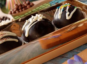 Drizzle melted white chocolate and decorate with multi sprinkles.