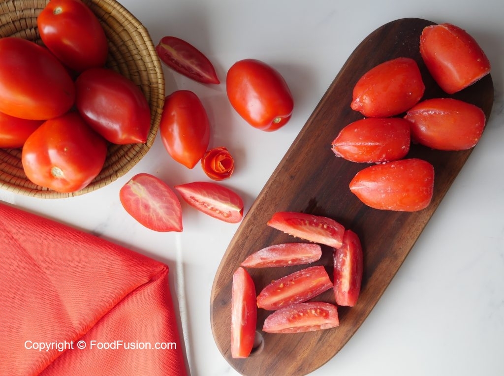 Tamatar ka head remove ker lein aur wedges or cubes mein cut ker lein.
