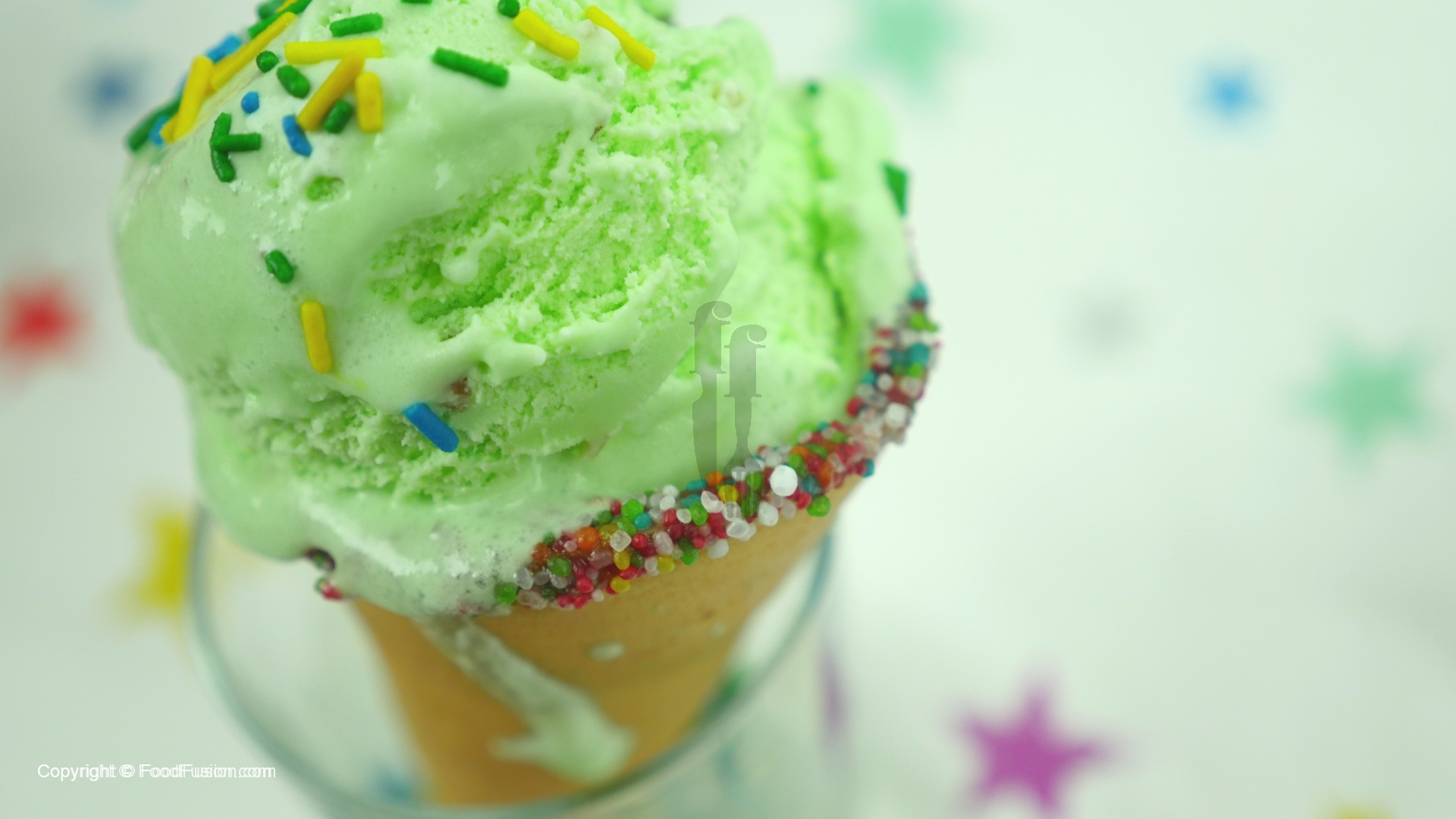 Ab tayyar cones ko melted chocolate,multi sprinkles mein dip karein,ice cream scoop rakh dein aur multi sprinkles,bunties aur chocolate sauce sa garnish karein.