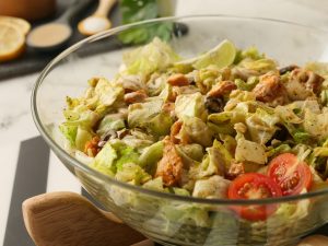 -Clean cutting board per iceberg lettuce ko chop ker lein & side per rakh dein.