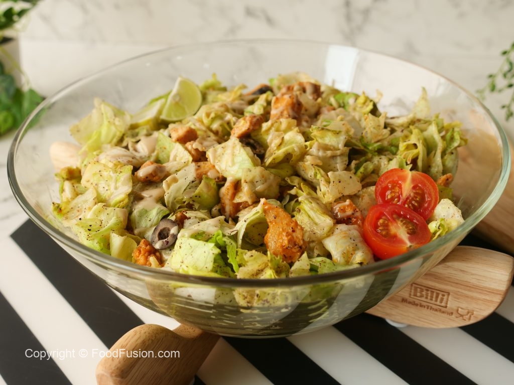 -Bowl mein chopped iceberg lettuce,olives,pickled jalapenos,sumac powder,darchini powder aur lemon juice dal ker ache tarhan mix aur toss ker lein.