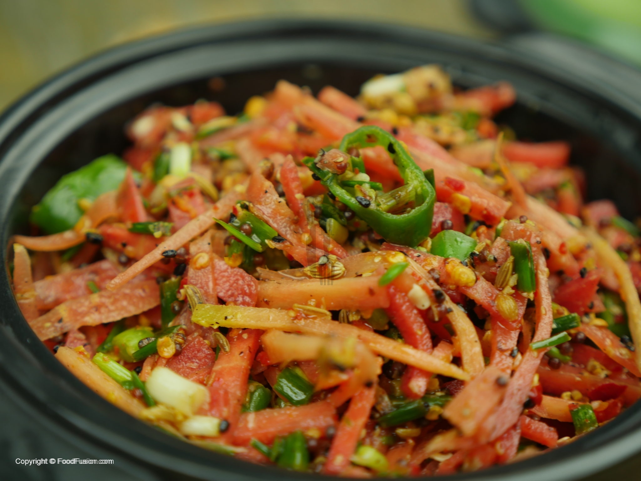 Bowl mein oil,kalonji (crushed),rai dana (crushed),dhania (crushed),namak,kuti lal mirch,saunf (crushed),tatri,lehsan paste,hara lehsan,hari mirch aur gajar dal ker ache tarhan mix ker lein.