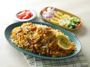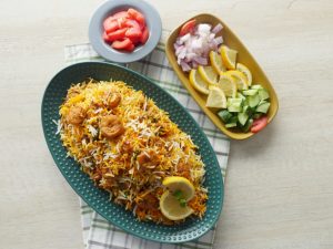 In pot,add half quantity of boiled rice,fried onion,prawn gravy masala,fresh coriander,remaining boiled rice,dissolve yellow food color and fried onion.
