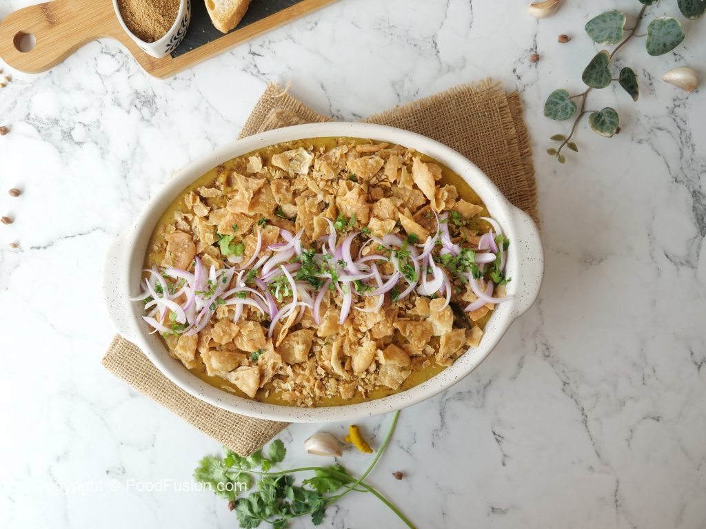 -Sprinkle chaat masala,papri,onion,fresh coriander & serve with bread!