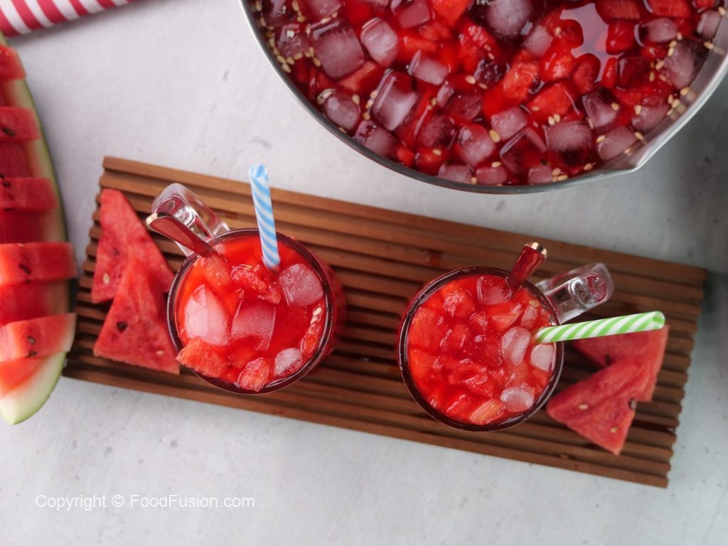 -Bowl mein ice cubes aur tarbooz (cut in small cubes) dal ker ache tarhan mix karein.