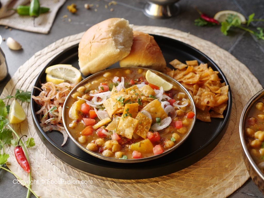 -Serving plate mein khathiawari choley,tayyar hari chutney,tamatar,chaat masala,lal mirch crushed, pyaz,papri aur hara dhania dal dein aur pav buns ka saath serve karein!