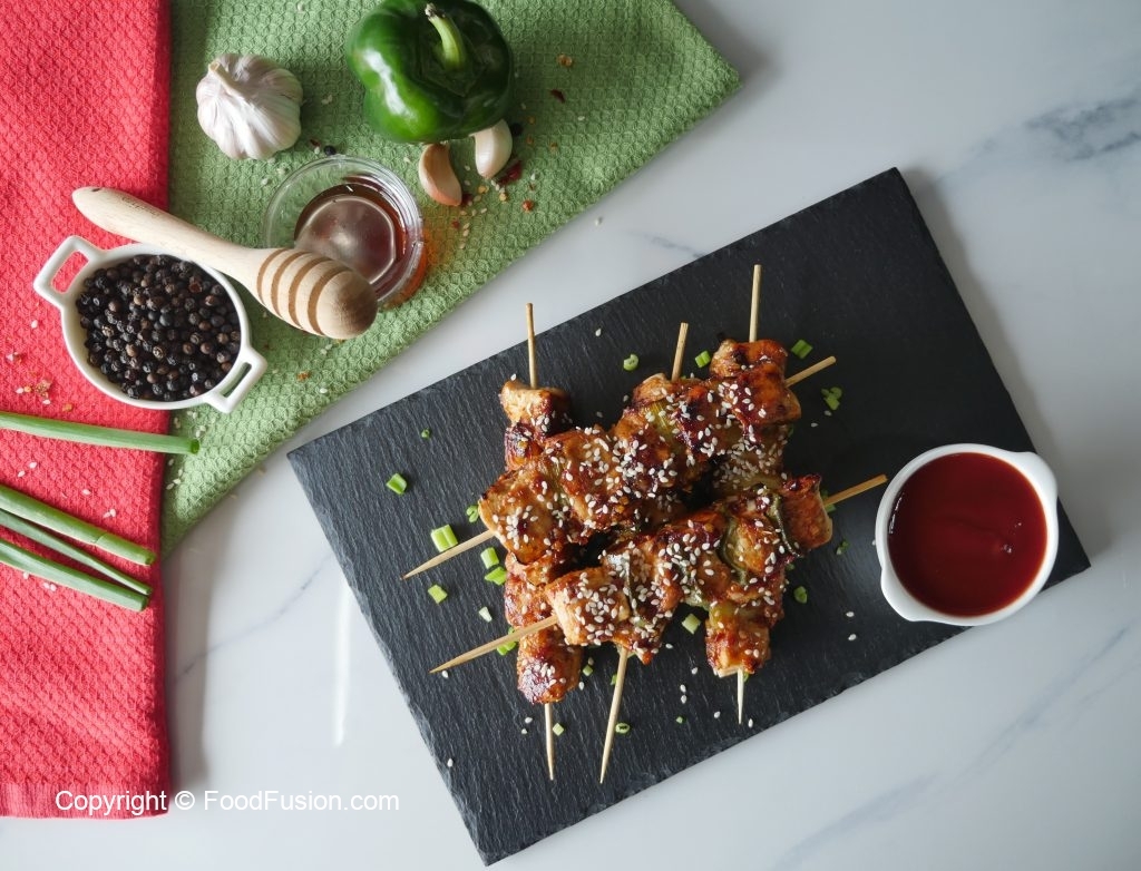 Thread chicken,capsicum and green onion white part into skewers.(Makes 6-7 skewers).