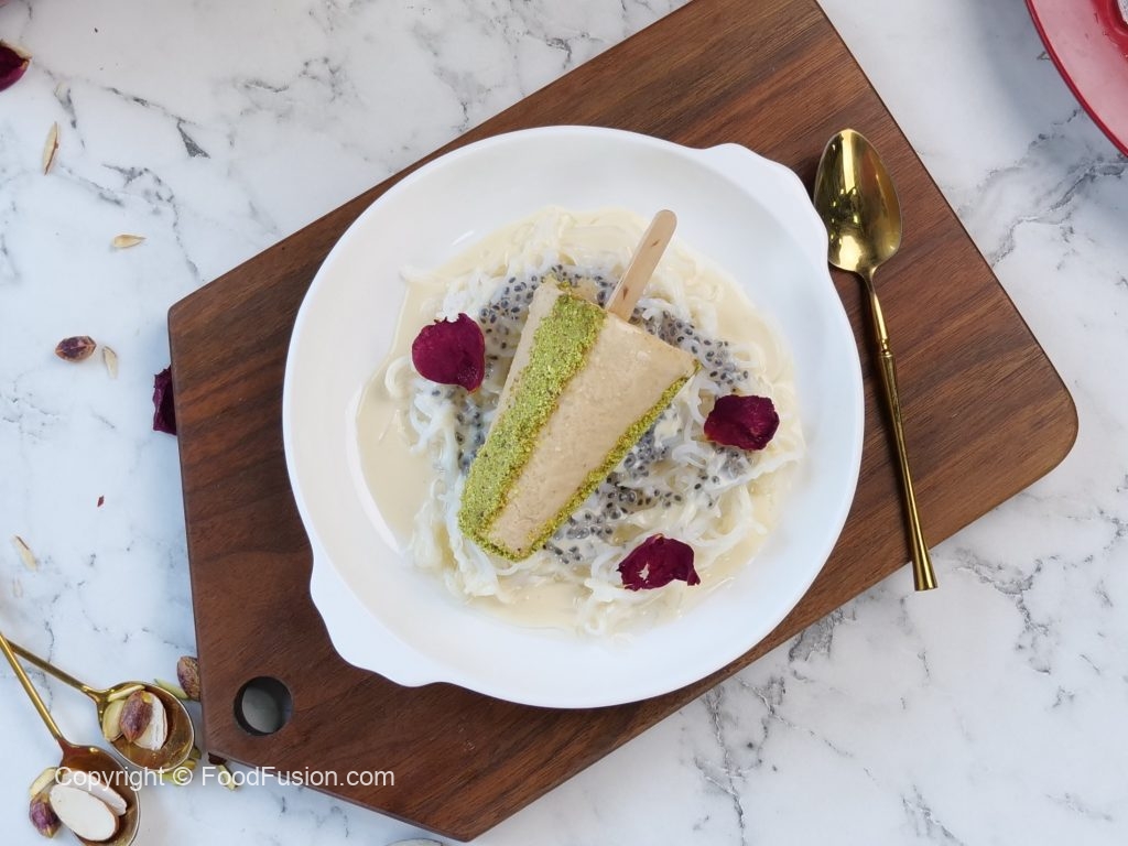 -On a serving plate,add falooda sawaiyan,soaked basil seeds,evaporated milk,kulfi & serve!