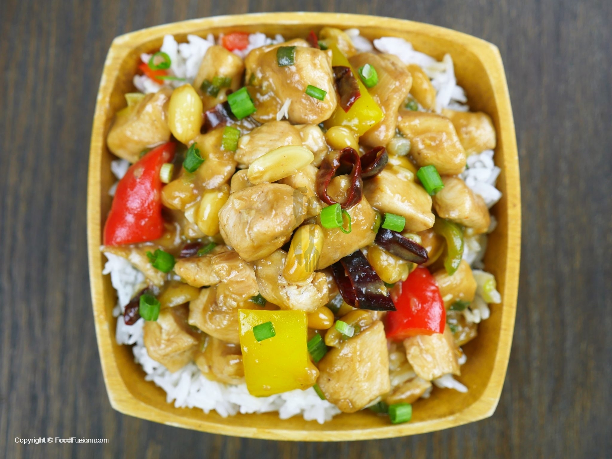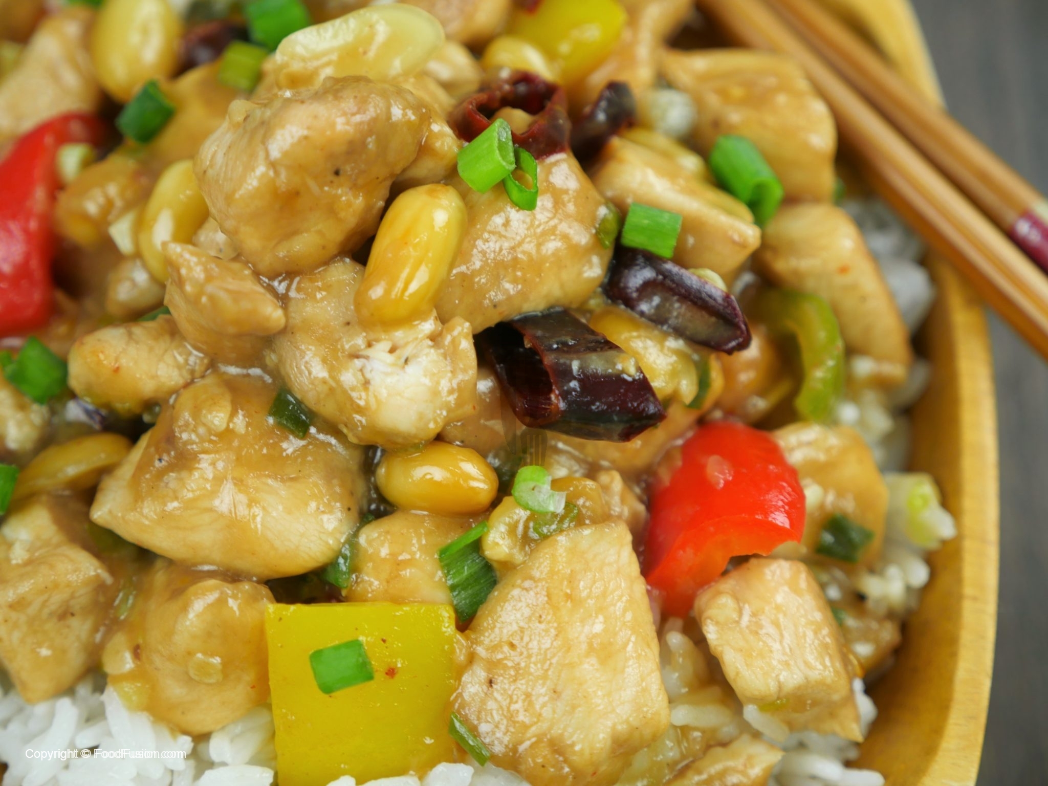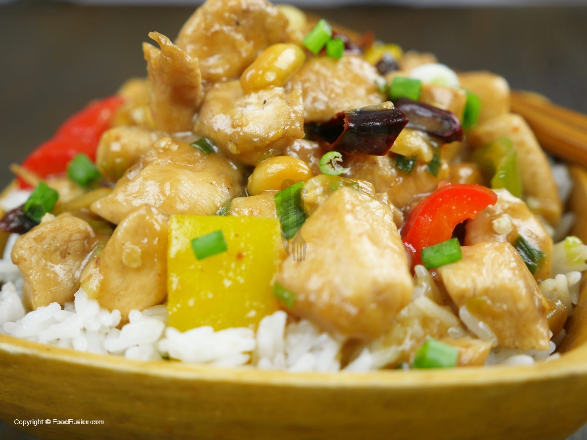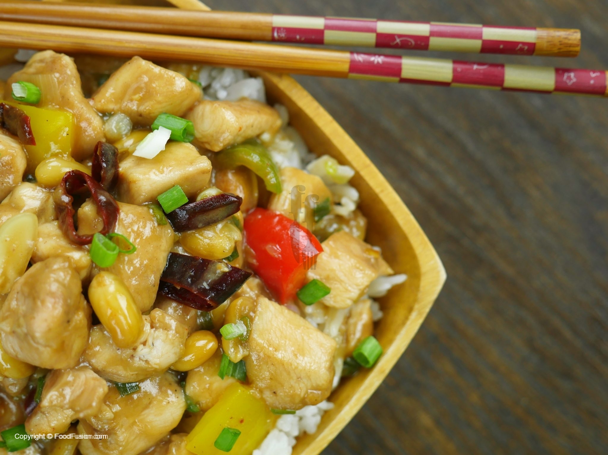 In a wok, add oil and saute dried red chilies, ginger, garlic. Add white part of green onion and bell pepper, saute and add chicken and sauce.