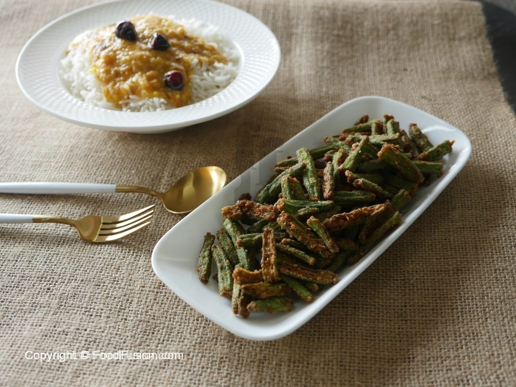 Bhindi ko dho ker pat dry karein aur vertically 4 pieces mein cut ker lein.