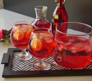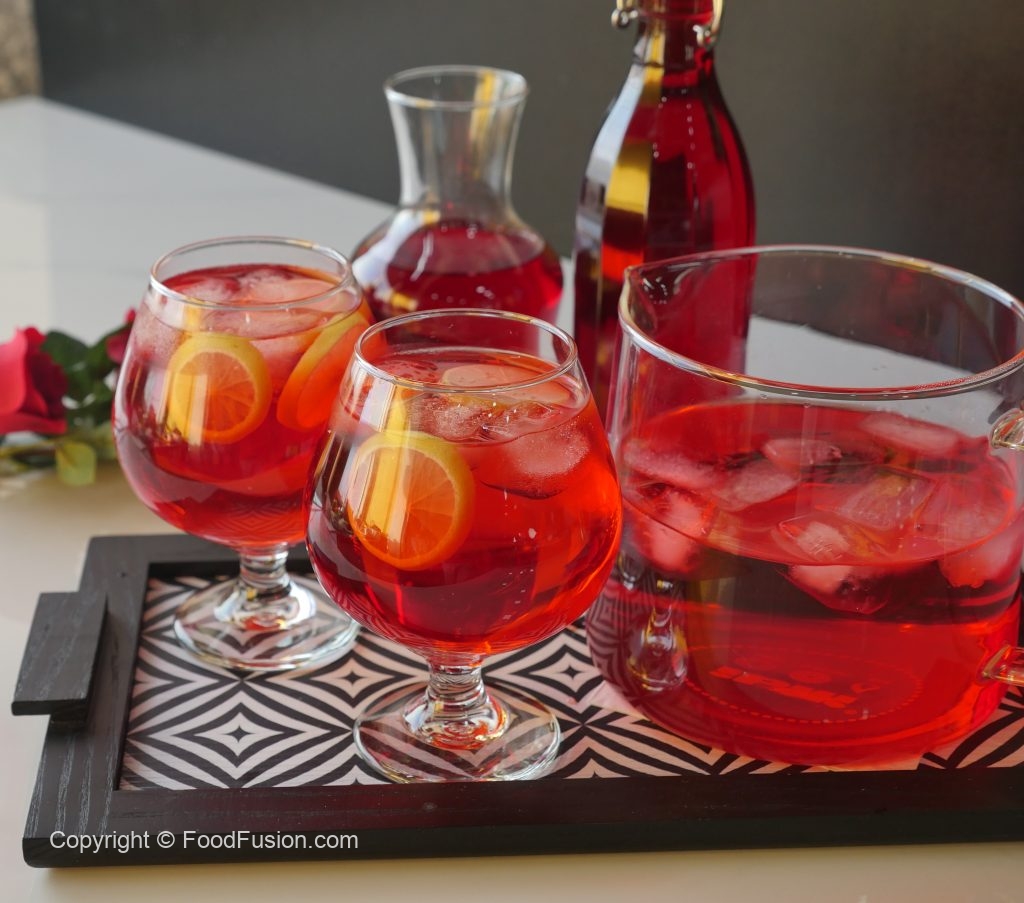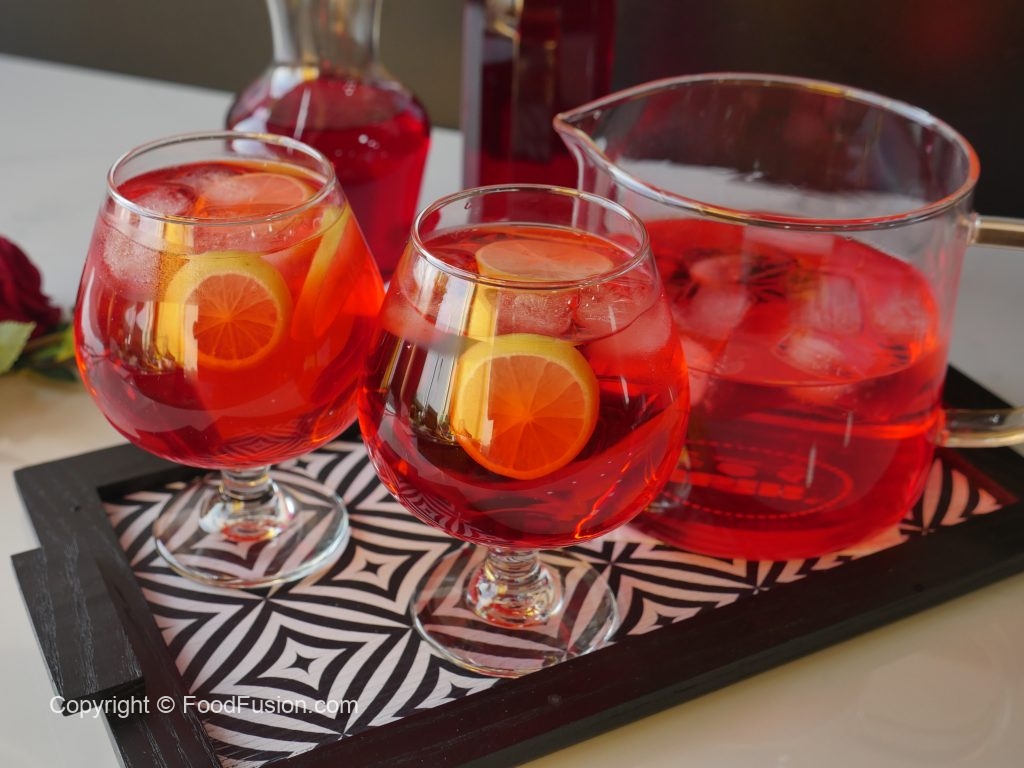 In serving glass,add ice cubes,lemon slices and prepared laal sharbart & serve!