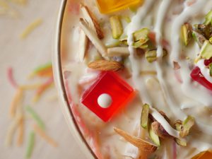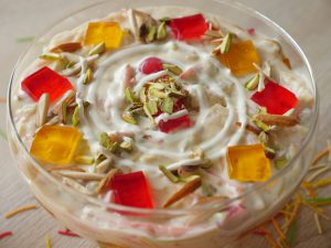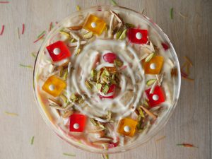 In serving dish,add red and yellow jelly,lab e shireen and garnish with red jelly,yellow jelly,dry nuts,cream & serve.