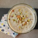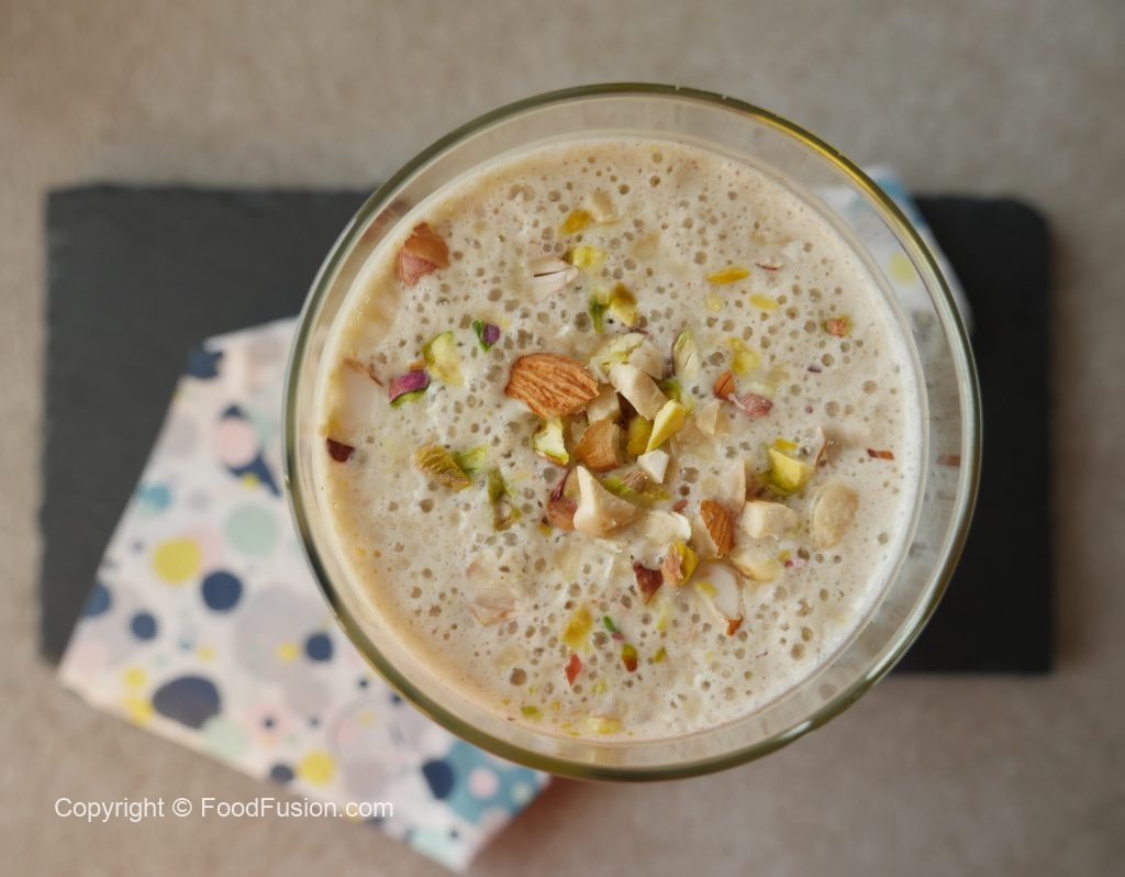 In grinder,add yogurt,banana,dates (deseeded),cardamom powder,ice cubes,milk and blend until well combined.