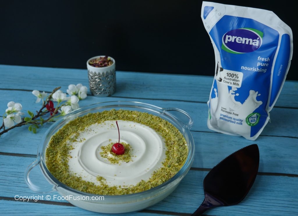 Serving dish mein tayyar cream ki layer dal ker evenly pheela lein.