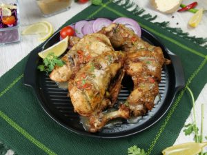-Steam rack rakh ker marinated chicken rakh dein aur brush ki madad sa remaining marinade laga lein aur dhak ker darmiyani ancch per 4-5 minutes kliya paka lein phir halki ancch per gul janay tak paka lein (20-25 minutes).