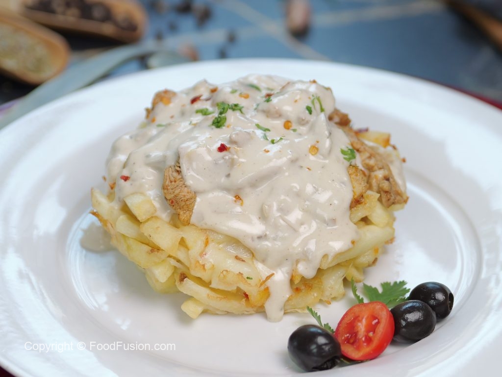 -In baking pan,add potato fries,creamy alfredo sauce,mozzarella cheese,potato fries,mozzarella cheese,red chilli crushed & fresh parsley.