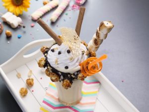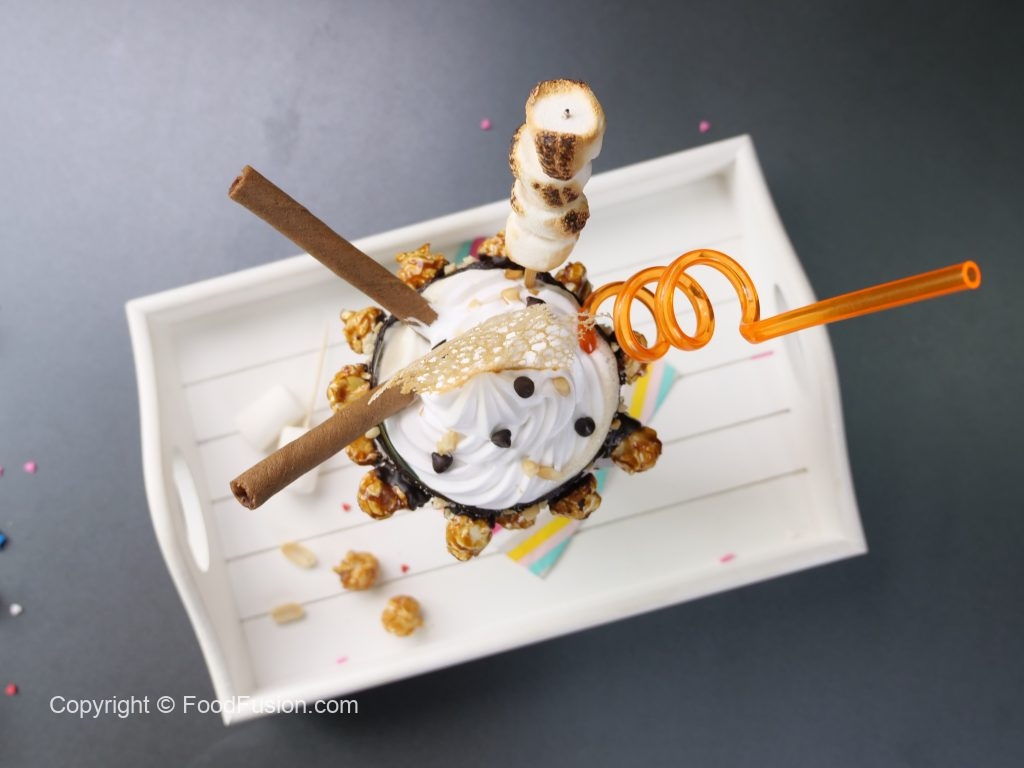-Add prepared caramel shake,whipped cream & decorate with chocolate chips,peanuts,roasted marshmallows,wafers sticks,caramel dressing & serve.