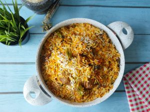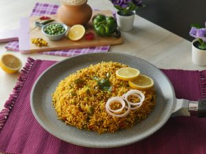 Add dissolve food color,fried onion,cover & steam cook on low flame for 10-12 minutes & serve!
