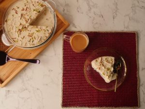 Slowly pour prepared milk malai syrup over the top of the cake,filling holes.