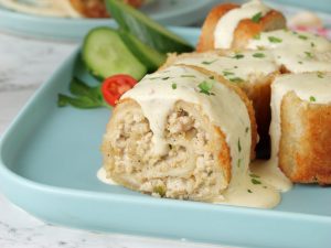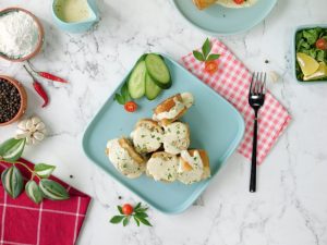 -Tayyar prepared malai chicken roll ups ko cut ker lein,tayyar creamy sauce aur hara dhania dal ker serve karein (makes 4-5).