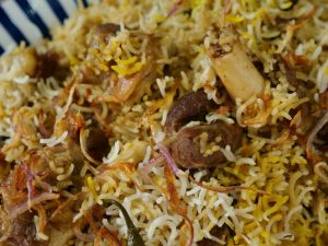 -Add & spread reserved gravy,sprinkle mint leaves,fresh coriander,green chillies,remaining boiled rice, reserved fried onion,mint leaves,dissolved saffron & biryani essence.