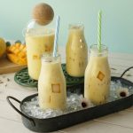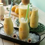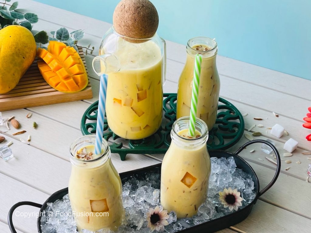 Serving bottle mein mango jelly cubes,tayyar doodh aur badam dal dein.