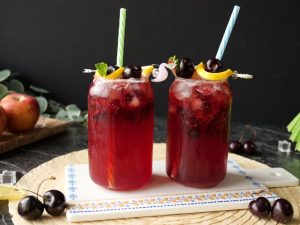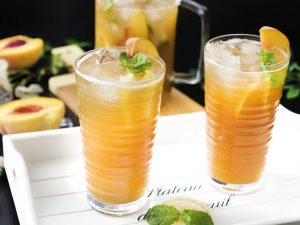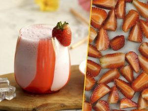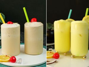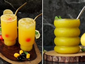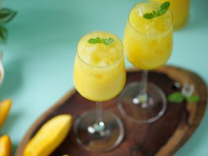 -Blending jug mein mango mixture,cheeni,lemon juice aur yellow food color dal ker ache tarhan blend ker lein phir stainer ki madad sa strain ker lein.