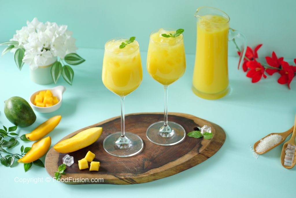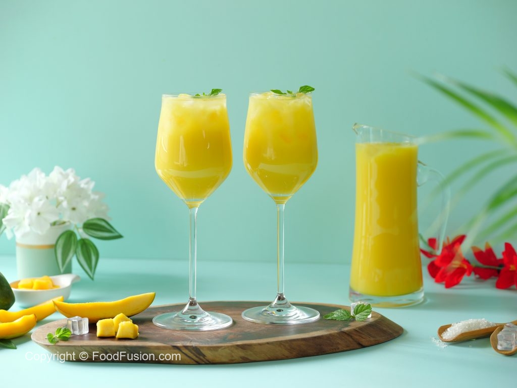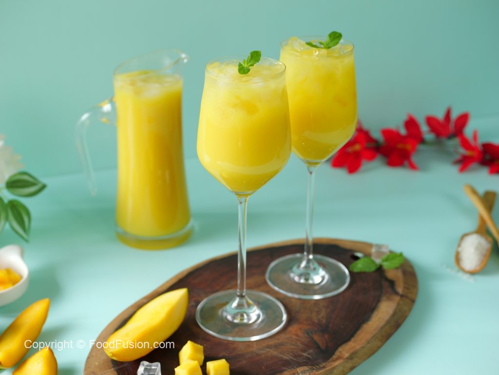 -In a serving glass,add ice,mango frooti,garnish with mint leaves & serve chilled!
