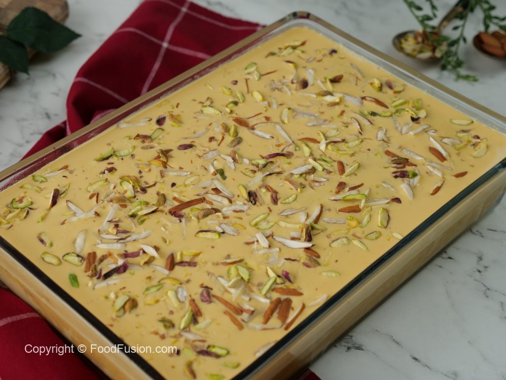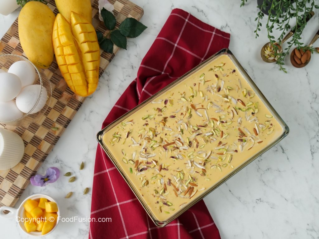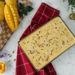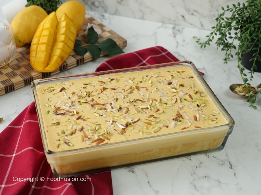 -Slowly pour prepared mango malai milk (reserve 1 cup for later use) over the top of the cake, filling holes,cover with cling film & refrigerate until chilled.