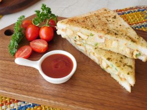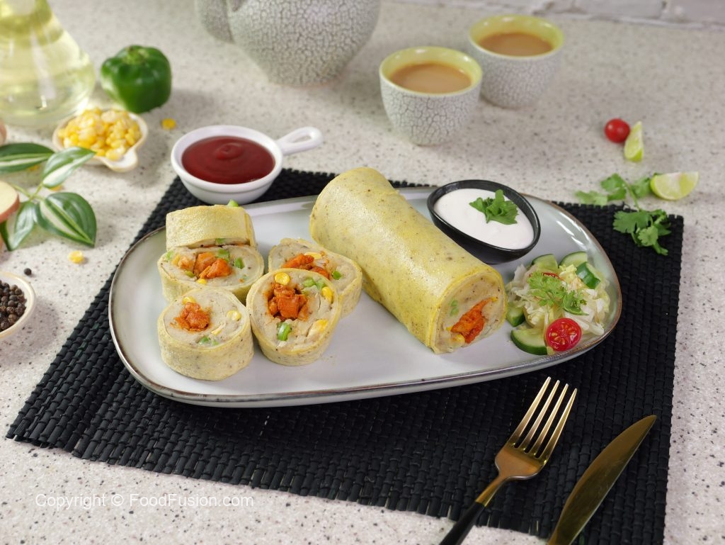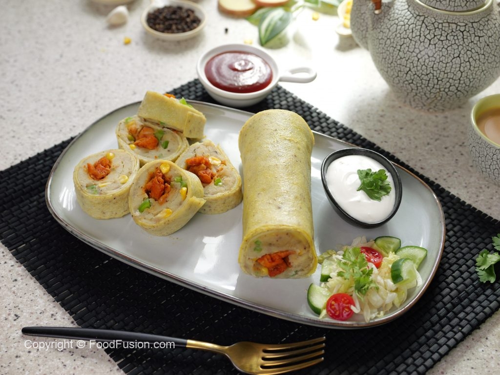 -Grease pan with cooking oil,add whisked eggs & cook on low flame for 1-2 minutes than fold the potato roll on cooked egg & move to one side of pan.