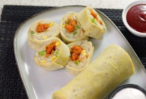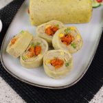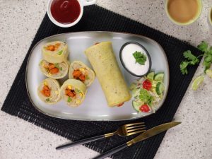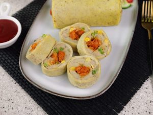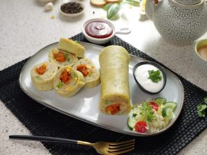 -Turn on the flame,grease pan with cooking oil,add whisked eggs & cook on low flame for 1-2 minutes than fold the potato roll on cooked egg & move to one side of pan.