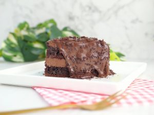 -Place first layer of cake on cake stand & apply prepared chocolate frosting.