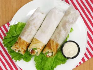 Dawn bread paratha per mayo garlic sauce,chicken cheese seekh kabab,pyaz slices,salad leaves aur mayo garlic sauce dal ker wrap ker lein aur serve karein.