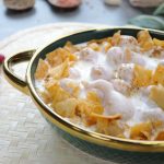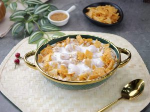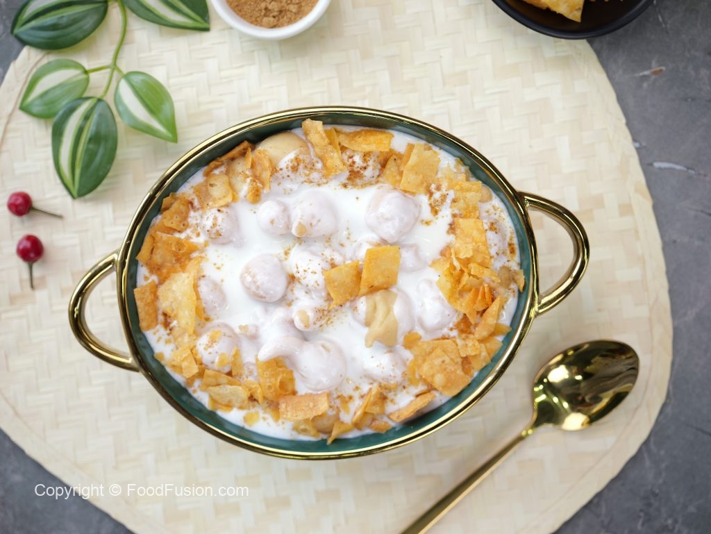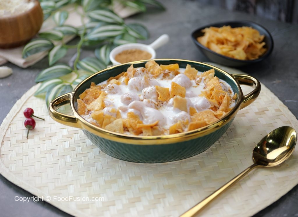 -In a serving dish,add soaked phulki,prepared meethi dahi,sprinkle chaat masala,garnish with papri & serve!