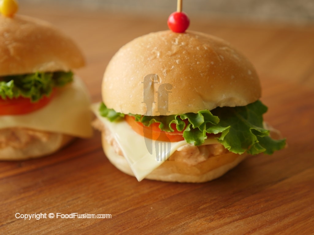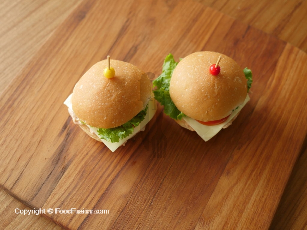 Mini burger bun per chicken mixture dal dein,cheese slice & tamatar slice,lettuce leaf rakh ker upper sa dusra bun rakh dein.