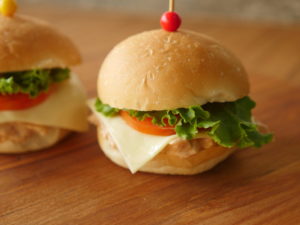 On mini burger bun,add chicken mixture,place cheese slice & tomato slice,lettuce leaf and place another bun on top.