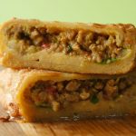 Add cooked mince,egg mixture and fold all edges of rolled dough and apply egg to seal the edges (makes 4-5).