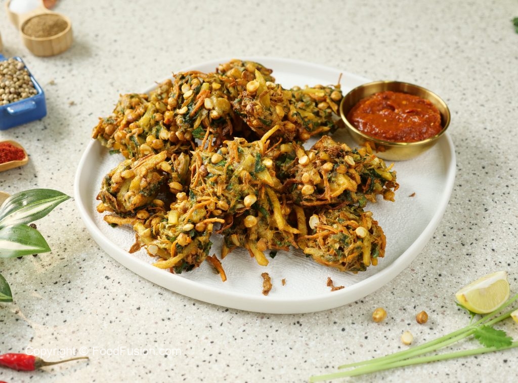 -Bowl mein baisan,chawal ka atta,zeera,pink salt,lal mirch powder,sabut dhania,baking soda,zarda ka rang,ajwain,hara dhania aur thora thora ker ka pani shamil karein aur ache tarhan whisk ker lein aur dhak ker 15-20 minutes kliya chor dein.