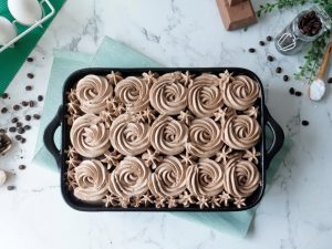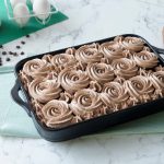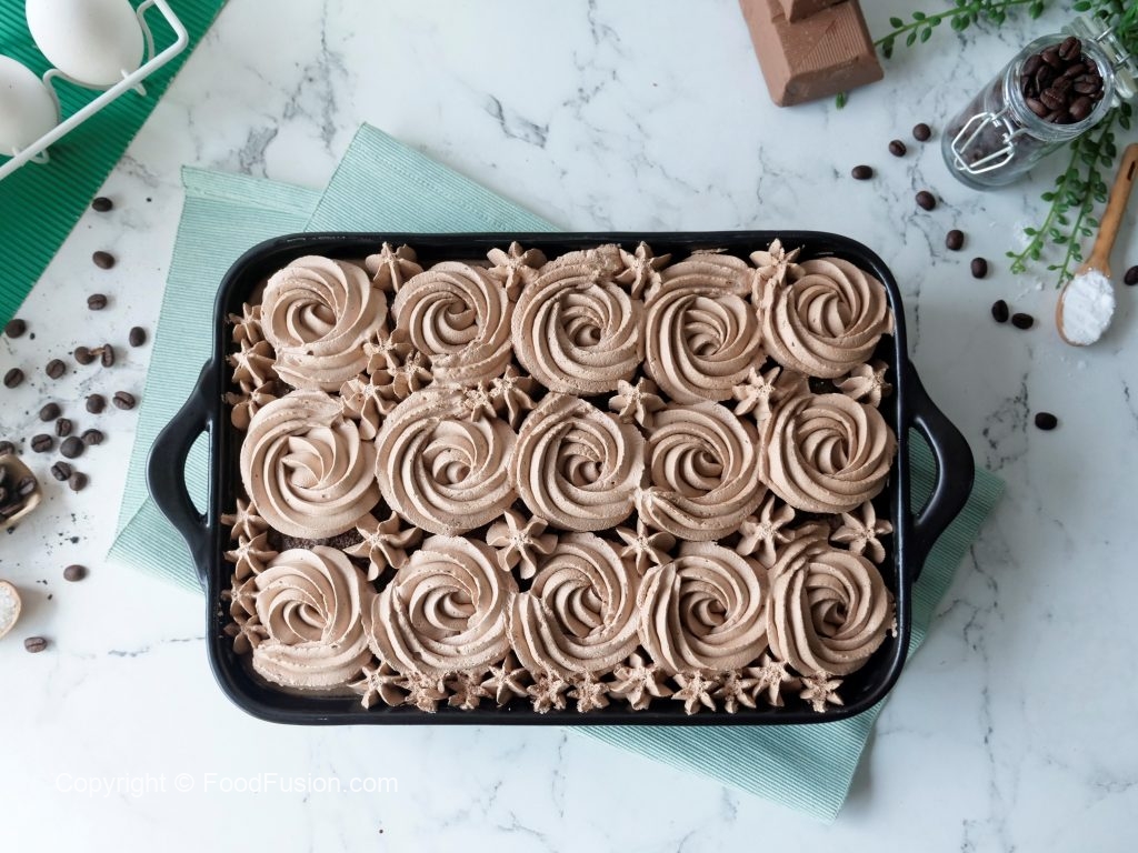 Wooden skewer ki madad sa cake ko poke ker lein aur tayyar mocha milk ko cake ka upper dal ker holes ko fill ker lein,cling film sa cover karein aur 4 hours kliya refrigerator mein rakh dein.