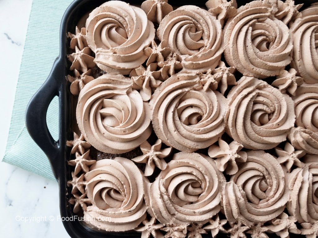 Poke the cake with the help of wooden skewer,pour prepared mocha milk over the top of the cake, filling holes,cover with cling film & refrigerate for 4 hours.