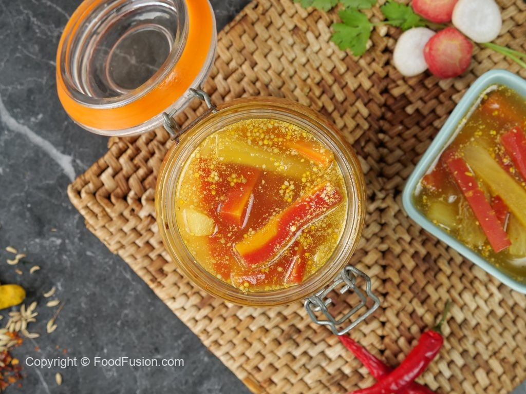-Bowl mein blanched vegetables,namak,lal mirch crushed,haldi powder,coarsely crushed saunf & raidana aur sirka dal ker ache tarhan mix karein aur dhak ker overnight kliya room temperature per chor dein.
