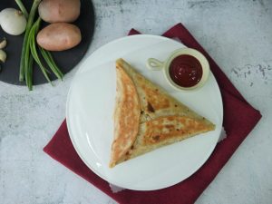 -On a rolled dough,add & spread prepared radish filling,fold one side of the rolled dough,apply water then fold the remaining two sides & make a triangle paratha.