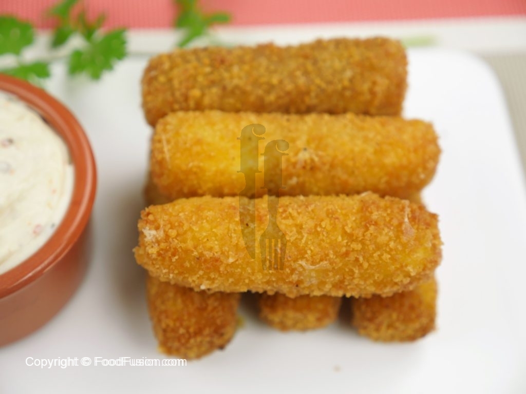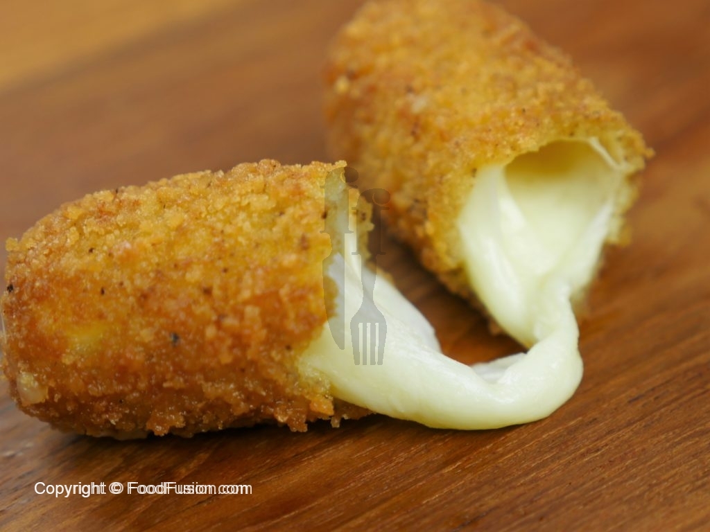 Coat mozzarella cheese stick in all-purpose flour,dip in beaten eggs then roll in bread crumbs and again dip in the beaten eggs and coat with bread crumbs.