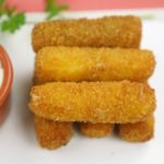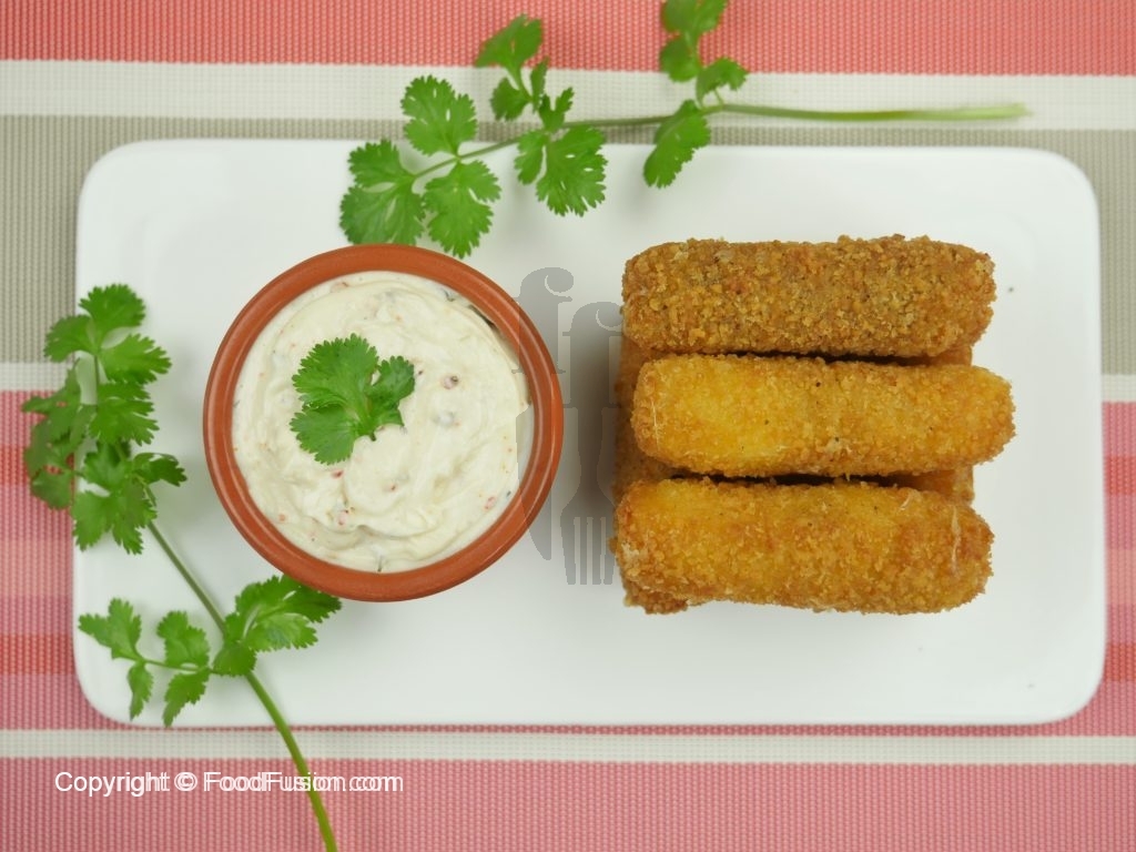 Mozzarella cheese sticks tayyar han,sour cream dip k saath serve karein.