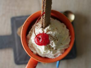 Whipped cream,cherry aur wafer sa garnish ker ka serve karein.